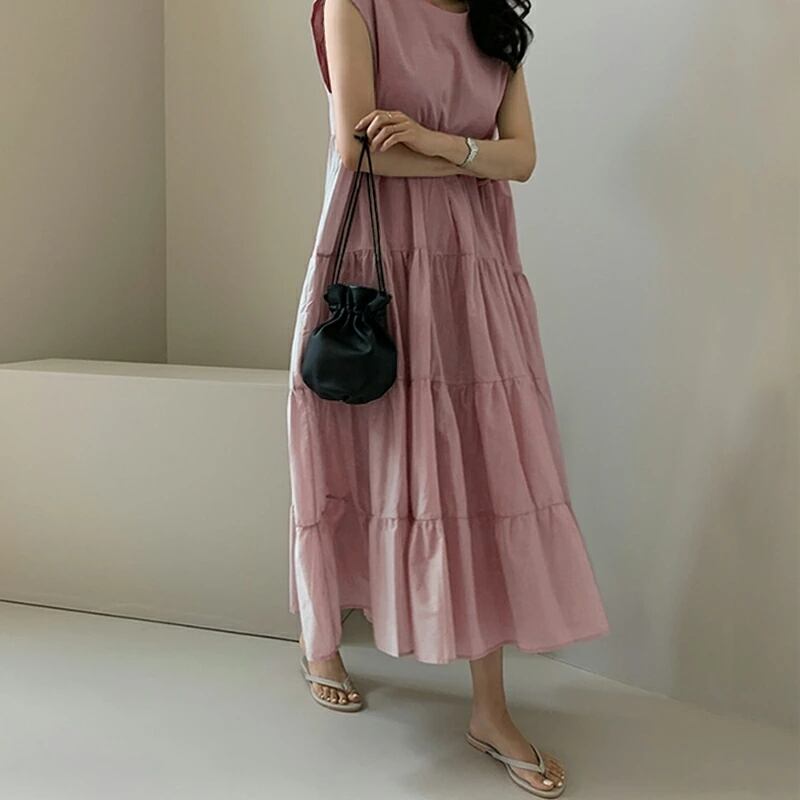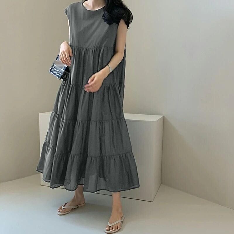 夏の新作、韓国風のロング丈ワンピースが登場しました!涼しい素材感と華やかなデザインが、夏のコーディネートにぴったり。ノースリーブで軽やかな着心地だけでなく、ラウンドネックと体型カバー効果も嬉しいポイントです。