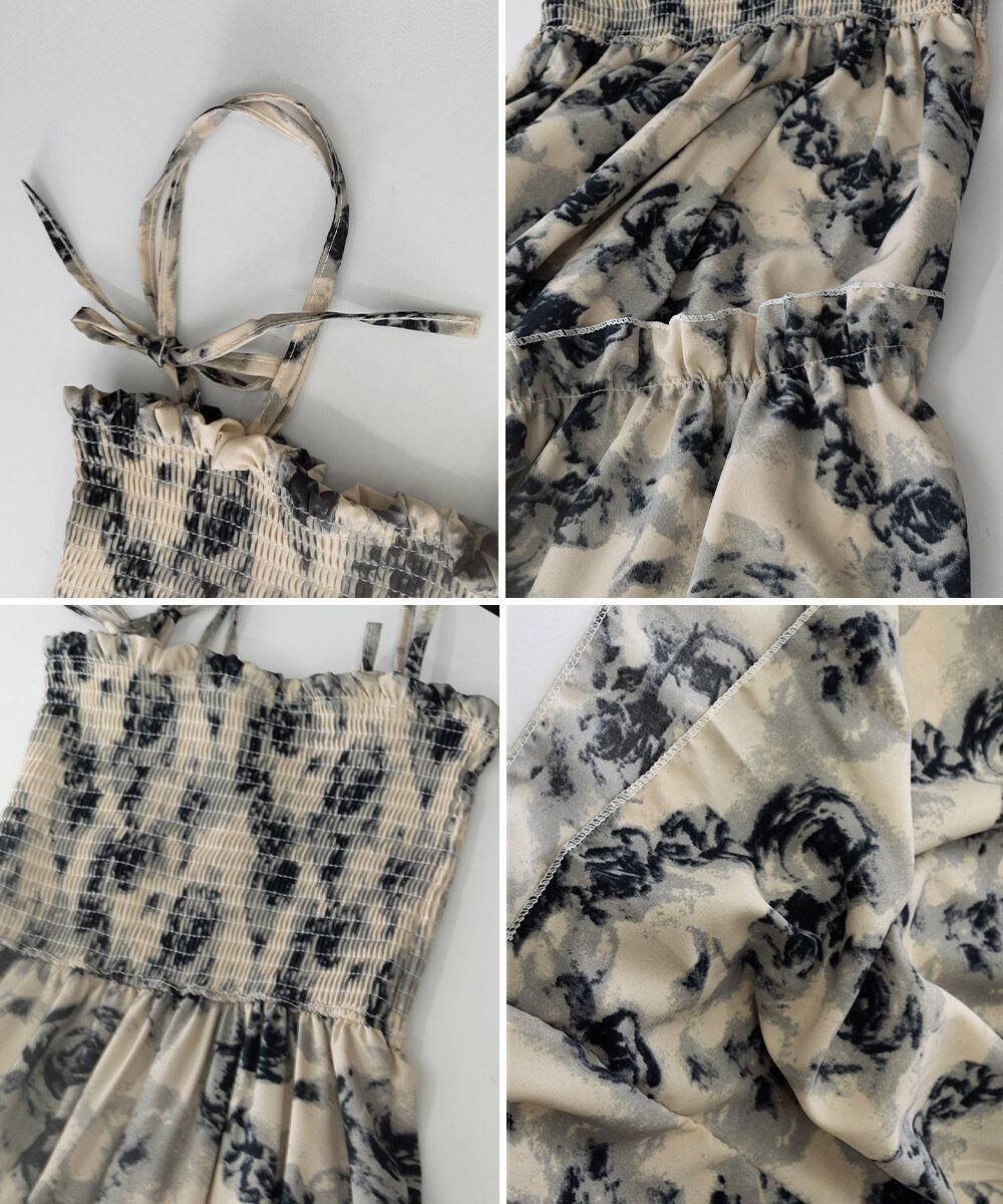 夏らしい鮮やかな花柄が印象的なキャミワンピース。胸元のシャーリングが女性らしいアクセントに。