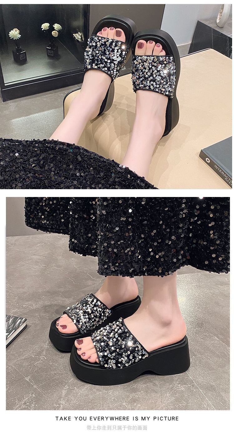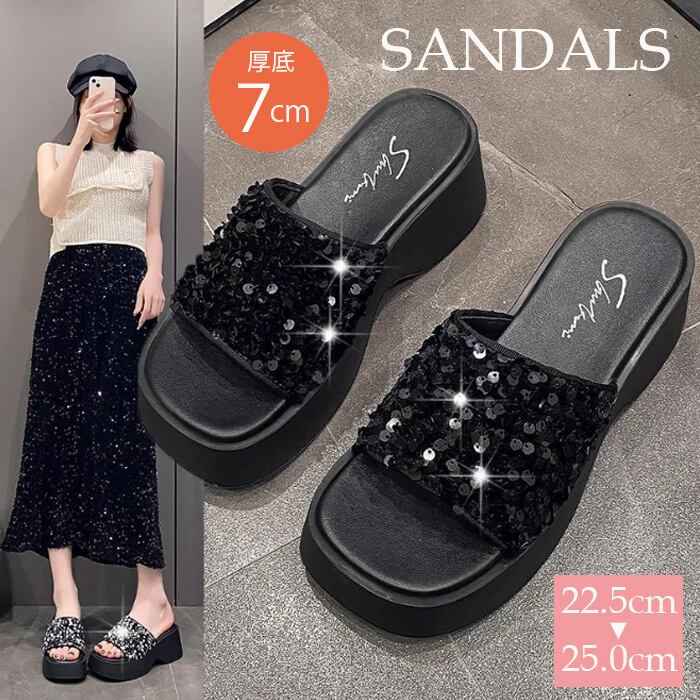 レディース ミュール オープントゥ スタイルアップ スパンコール 厚底 歩きやすい キラキラ
