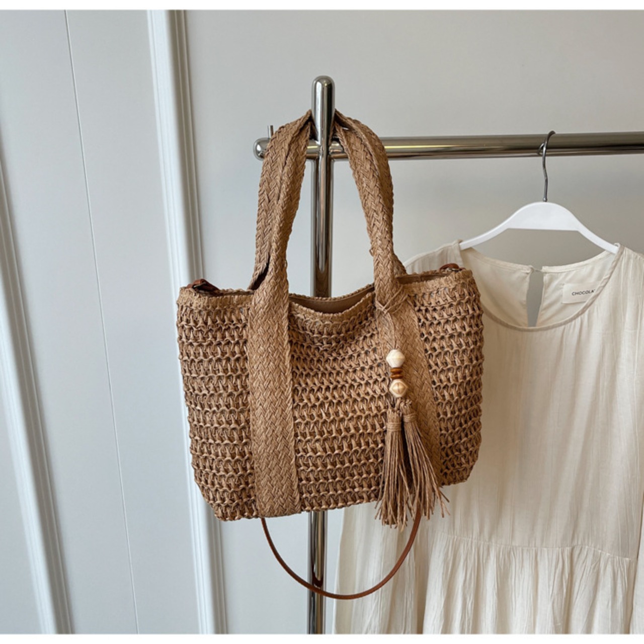 このハンドバッグは、ナチュラルなストローバッグデザインが魅力のアイテムです。かご風のスタイルは、夏のコーディネートにぴったりで、デイリー使いにも、リゾート地での特別な日にも最適!軽やかな雰囲気を演出し、季節感を大切にしたい方におすすめです。